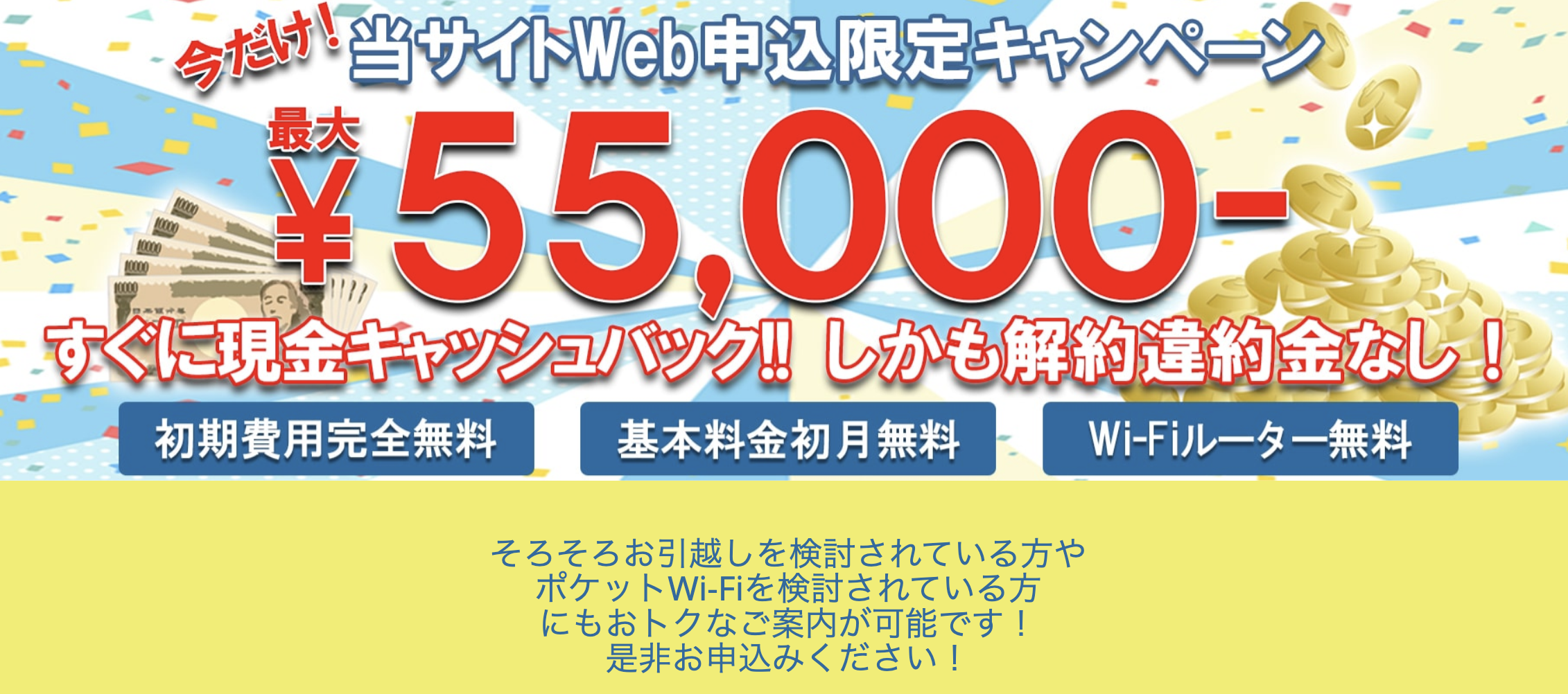 キャッシュバック金額は最大55,000円で、開通日に口座振込みで実施されます。