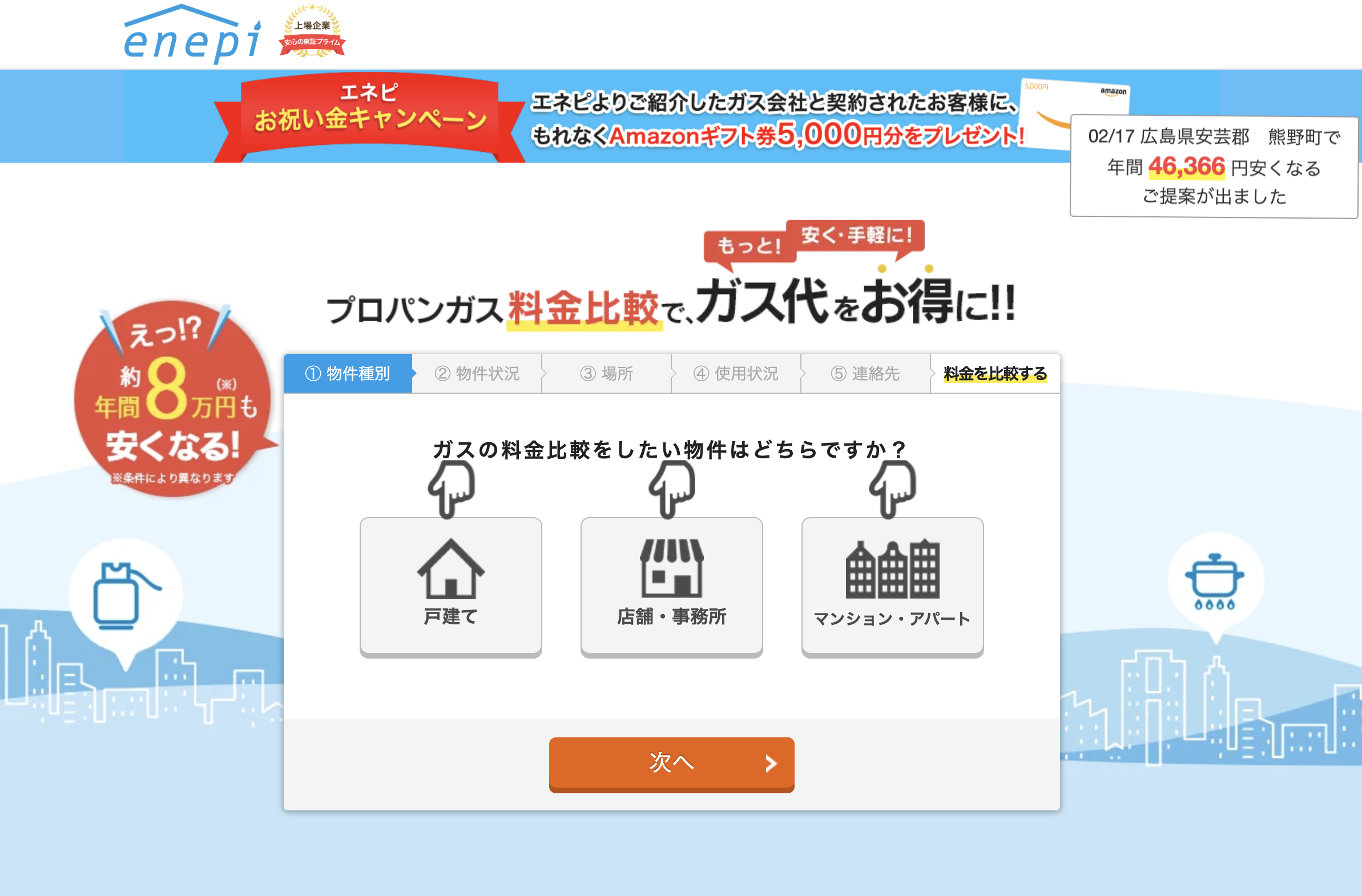 enepi(エネピ)は、プロパンガス会社の料金を無料で一括比較できる見積もりサービスです。