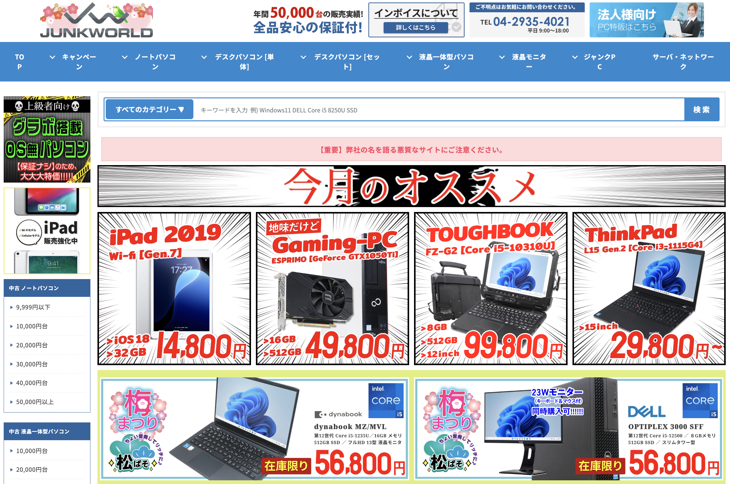 ジャンクワールドは、激安価格と安心保証を両立した中古パソコン専門ショップです。